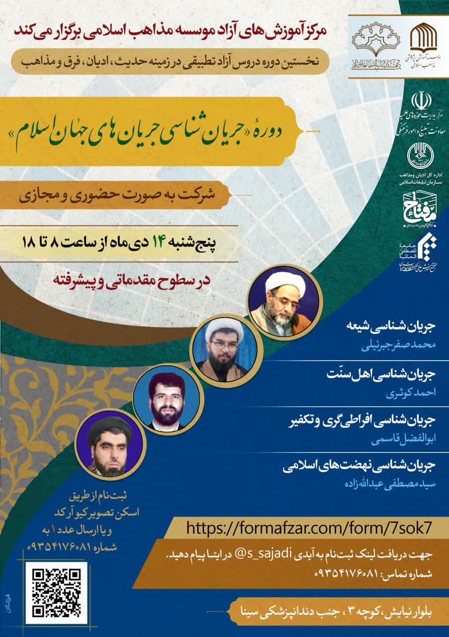 دوره جریانشناسی جریانهای جهان اسلامی پنج شنبه 14 دیماه از ساعت 8 صبح تا 18 به نشانی قم، بولوار نیایش، جنب دندانپزشکی سینا برگزار میشود که شرکت به صورت حضوری و مجازی در آن امکانپذیر است.