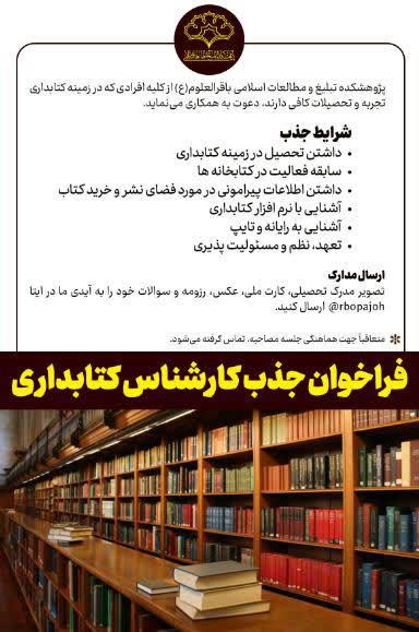 پژوهشکده تبلیغ و مطالعات اسلامی باقرالعلوم(ع) از کلیه افرادی که در زمینه کتابداری تجربه و تحصیلات کافی دارند، دعوت به همکاری مینماید.