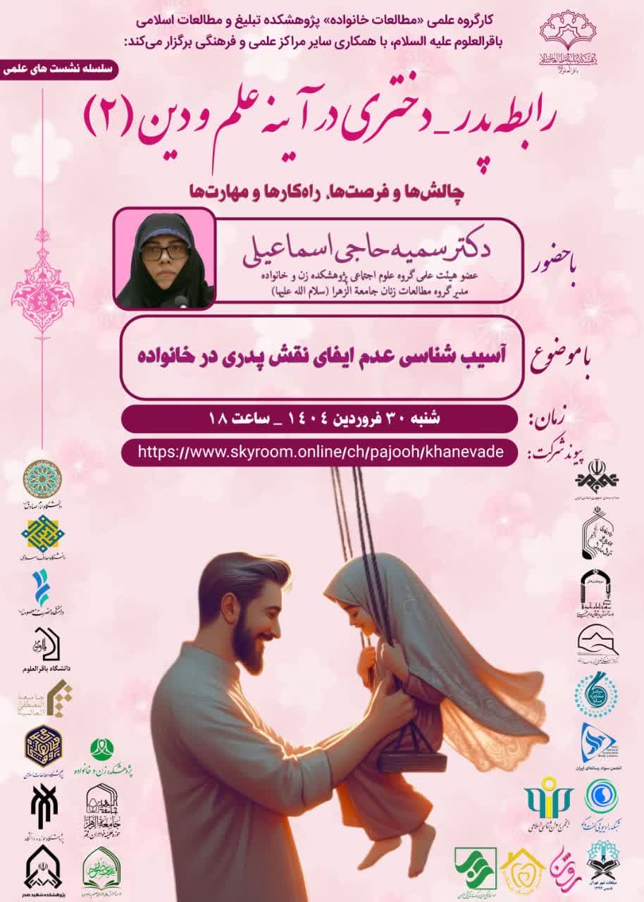 به گزارش روابط عمومی پژوهشکده تبلیغ و مطالعات اسلامی باقرالعلوم (علیهالسلام)، در چارچوب سلسله نشستهای علمی «پدر-دختری در آینه علم و دین ۲»، نشستی تخصصی با عنوان محوری «آسیبشناسی عدم ایفای نقش پدری در خانواده» روز شنبه برگزار گردید. این رویداد علمی که به همت گروه مطالعات خانواده پژوهشکده باقرالعلوم (علیهالسلام) سازماندهی شده بود، با استقبال جمعی از پژوهشگران، دانشجویان رشتههای مرتبط، فعالان دغدغهمند حوزه خانواده و علاقهمندان به مسائل اجتماعی و تربیتی روبرو شد. هدف اصلی این نشست، بررسی علمی و دینی ابعاد مختلف نقش پدر و واکاوی پیامدهای ناشی از کمرنگ شدن یا غیبت این نقش حیاتی در نهاد خانواده بود.