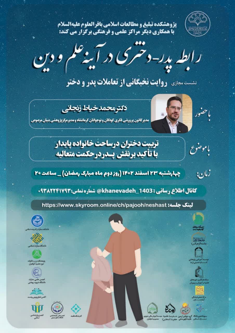 به گزارش روابط عمومی پژوهشکده تبلیغ و مطالعات اسلامی باقرالعلوم علیهالسلام، کارگروه علمی مطالعات خانواده پژوهشکده تبلیغ و مطالعات اسلامی باقرالعلوم علیهالسلام با همکاری سایر مراکز علمی و فرهنگی، پنجمین جلسه از سلسله نشستهای علمی "رابطه پدر _ دختری در آینه علم و دین" را برگزار میکند.