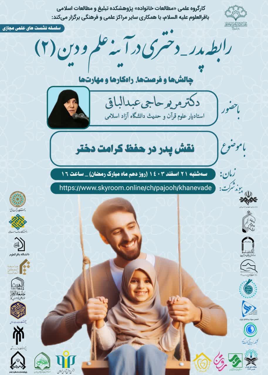 به گزارش روابط عمومی پژوهشکده تبلیغ و مطالعات اسلامی باقرالعلوم (علیهالسلام)، نشست علمی «پدر دختری» از سلسله نشستهای «پدر دختری در آینه علم و دین ۲»، با عنوان «نقش پدر در حفظ کرامت دختر»، به همت گروه مطالعات خانواده پژوهشکده و با ارائهی سرکار خانم دکتر مریم حاجی عبدالباقی برگزار شد. این نشست که دهمین جلسه از این سلسله نشستها بود، در فضایی علمی و تعاملی، با حضور علاقهمندان برگزار گردید.