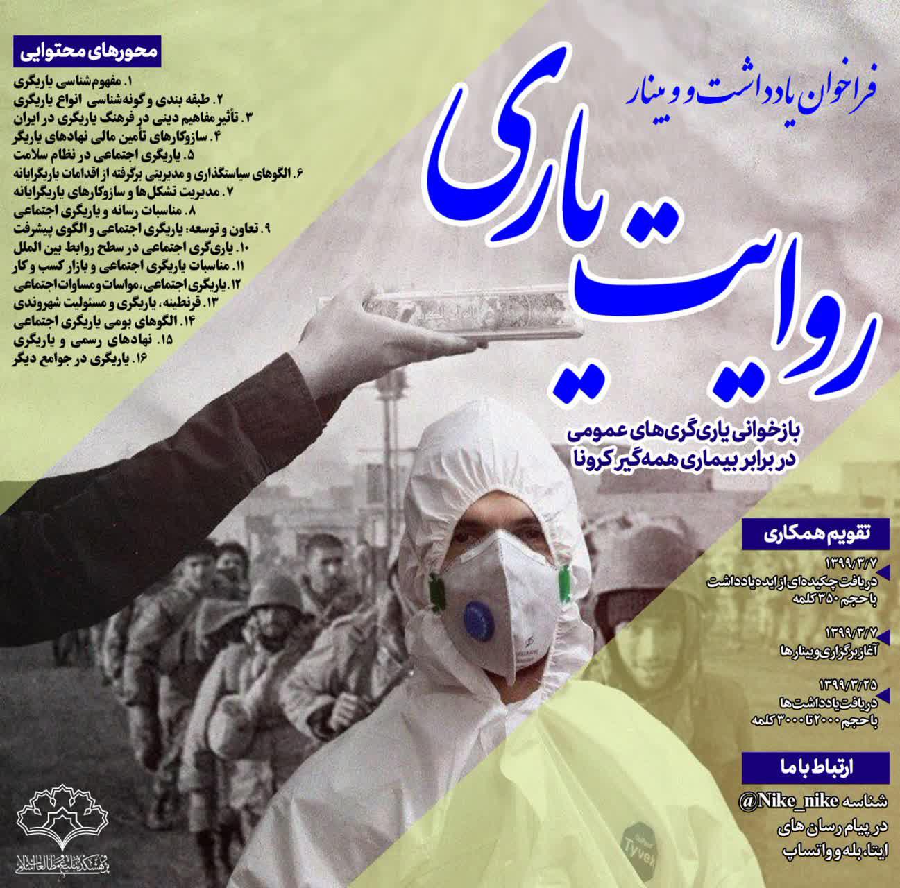 گروه مطالعات اجتماعی پژوهشکده تبلیغ و مطالعات اسلامی باقرالعلوم(علیهالسلام) در نظر دارد طی برنامه پژوهشی «روایت یاری»، ابعاد و سازوکارهای یاریگری عمومی در برابر بیماری کرونا را موضوع یک مطالعه و بازاندیشی جمعی قرار بدهد. جامعه ما با وجود ناکارآمدیهای مدیریتی و محدودیتهای تحریمی این امکان را یافت که در برابر این بحران با موفقیتی نسبی ایستادگی کند. بخش عمدهای از این امکان به یاریگریهای عمومی و نظم مدنیای باز میگشت که دستمایه شکلدهی کنشها، نهادها و فرایندهای حمایتی متنوعی در این دوره شد. این برنامه میکوشد با تأمل بر ظرفیتهای مدنی در محورهای اعلام شده، زمینه را برای تبدیل اقدامهای حمایتی دوران کرونا به سیاستهای اجتماعی در دوره پساکرونا هموار سازد.
