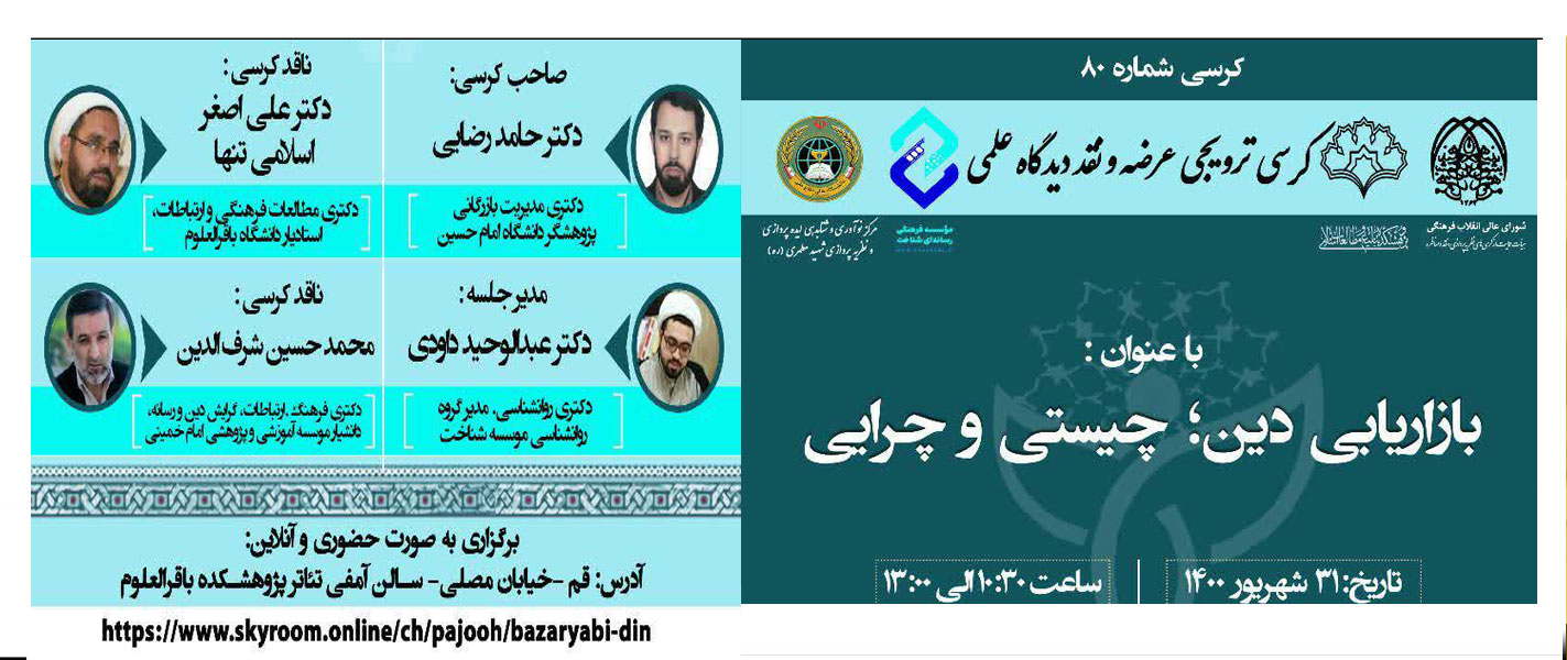 زمان: 31 شهریور 1400، ساعت 9:30 مکان: قم، خیابان مصلی، سالن آمفی تئاتر پژوهشکده تبلیغ ومطالعات اسلامی باقر العلوم (علیه السلام) www.skyroom.online/ch/pajooh/bazaryabi_din